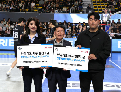 아라리오, '천안 유소년 배구' 발전 위해 1천만원 후원천안 향토기업 ㈜아라리오는 지난 19일(목) 천안 유관순체육관에서 열린 현대캐피탈 스카이워커스 배구단 홈경기에 앞서 지역사회 배구 꿈나무를 지원하는 발전기금 1천만 원을 천안 봉서중학교와 쌍용중학교 배구부에 각각 5백만 …